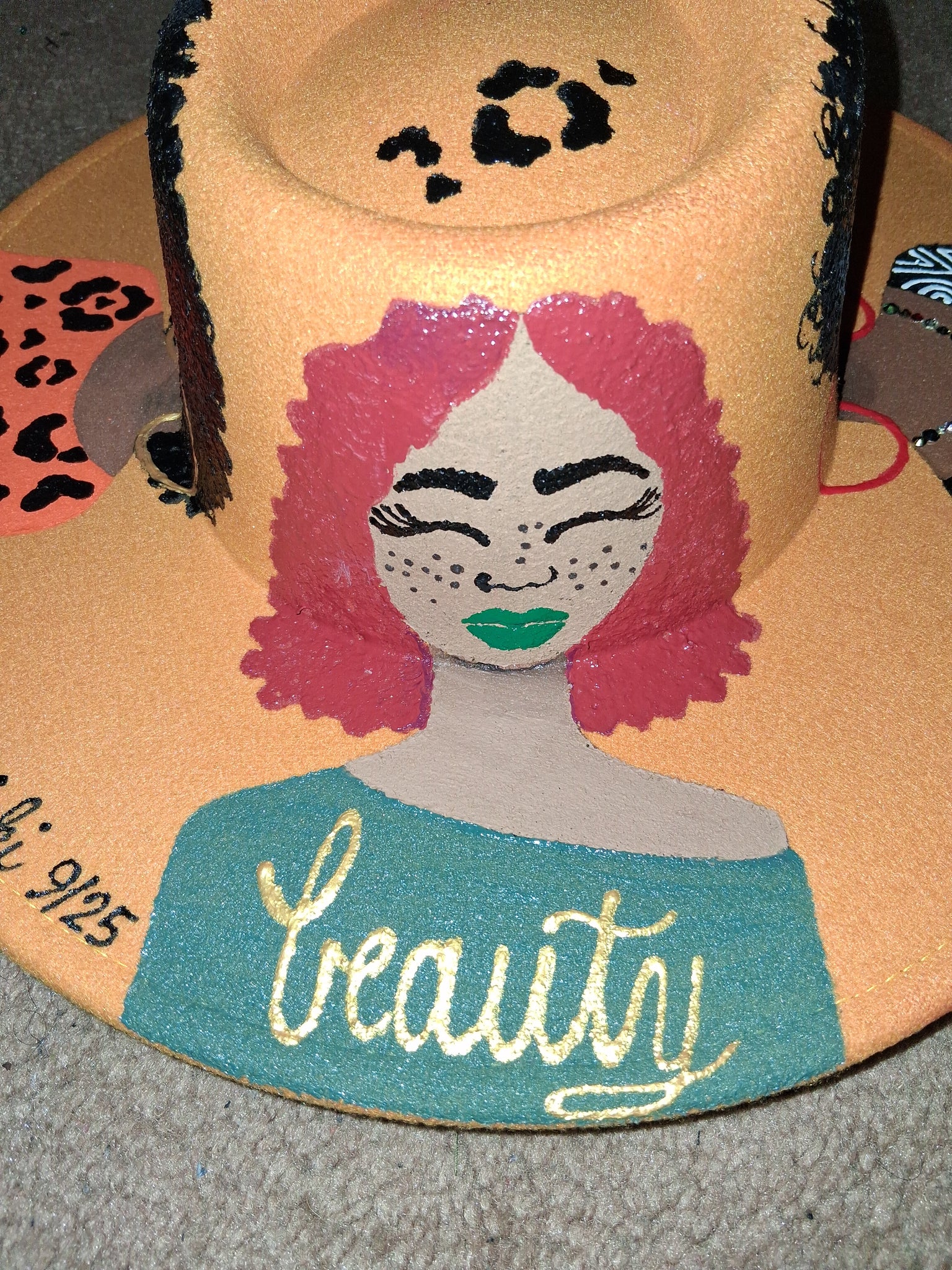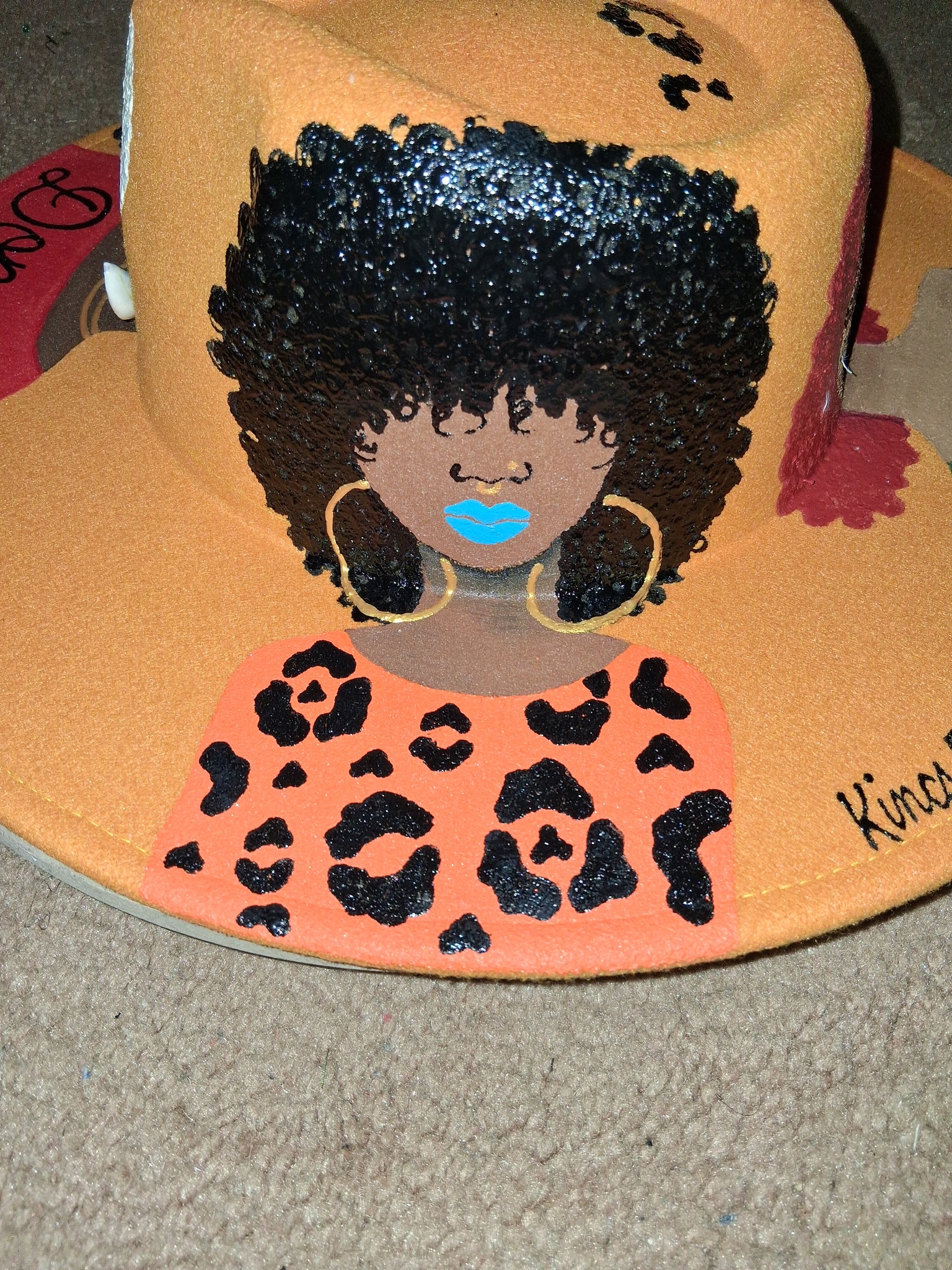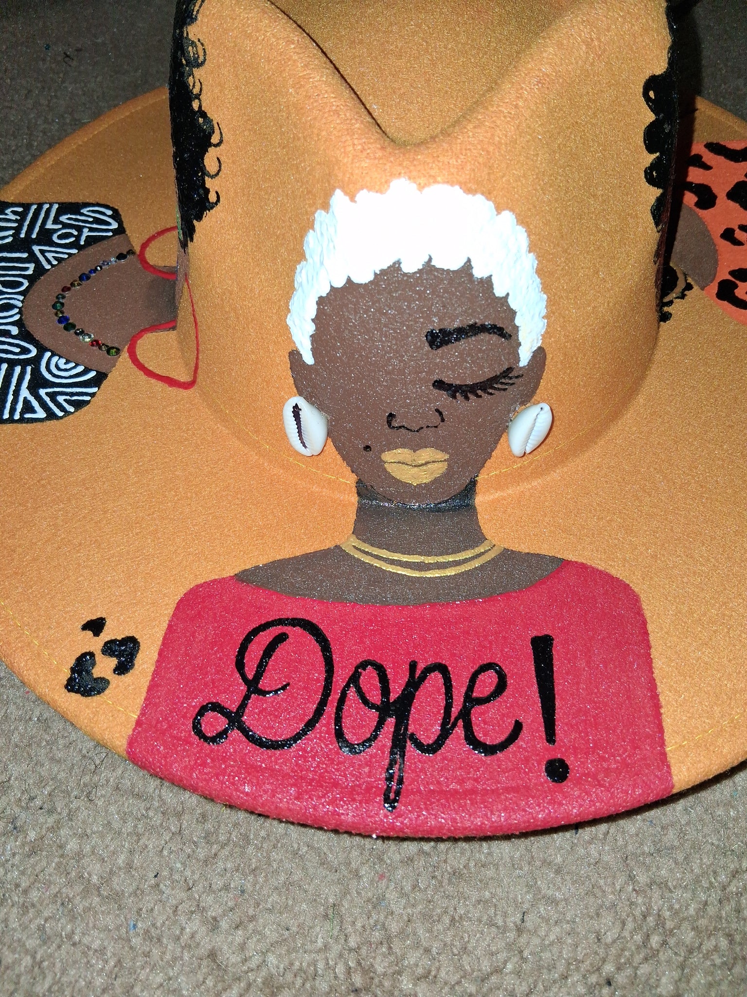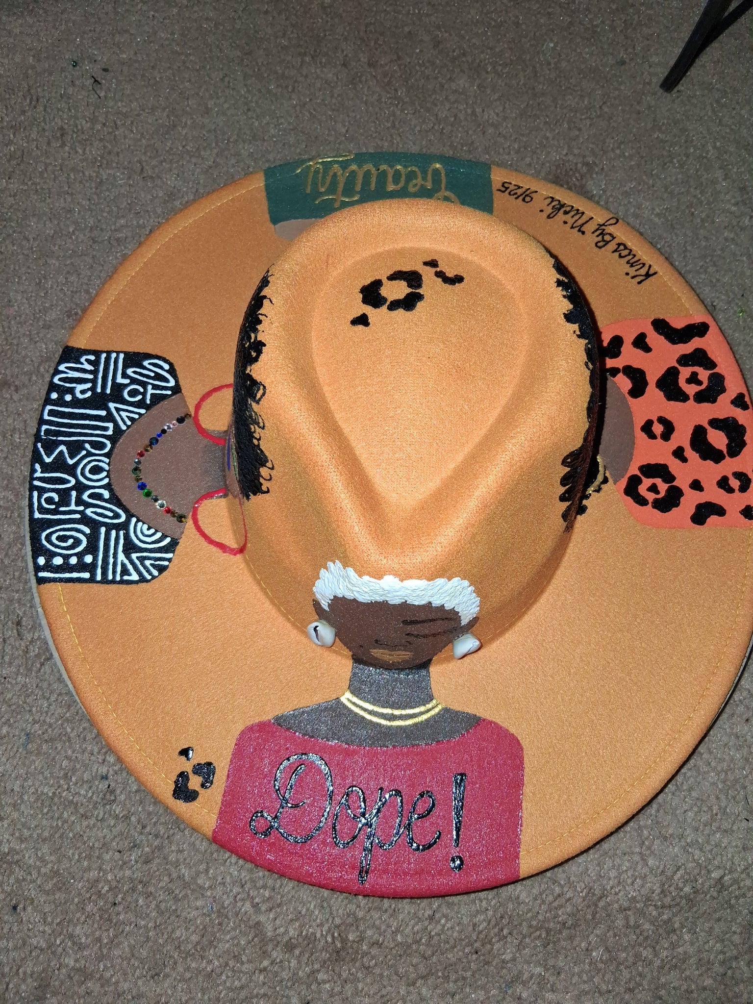 This mustard felt fedora is adorned with fabric paint, courier shells and rhinestones.