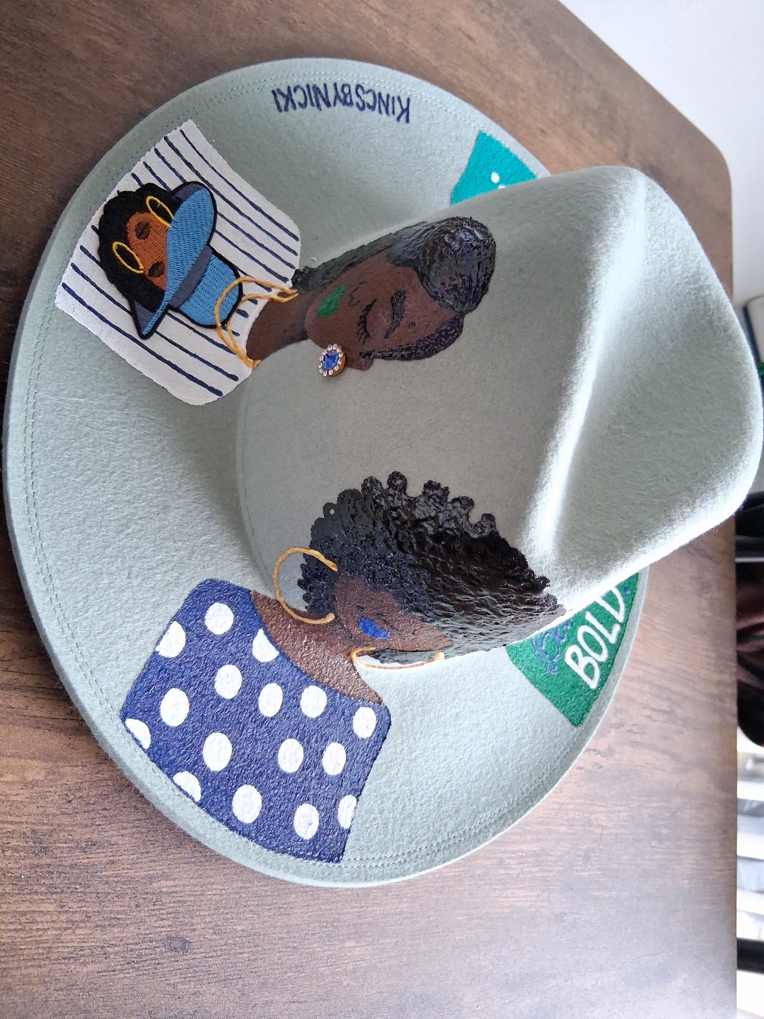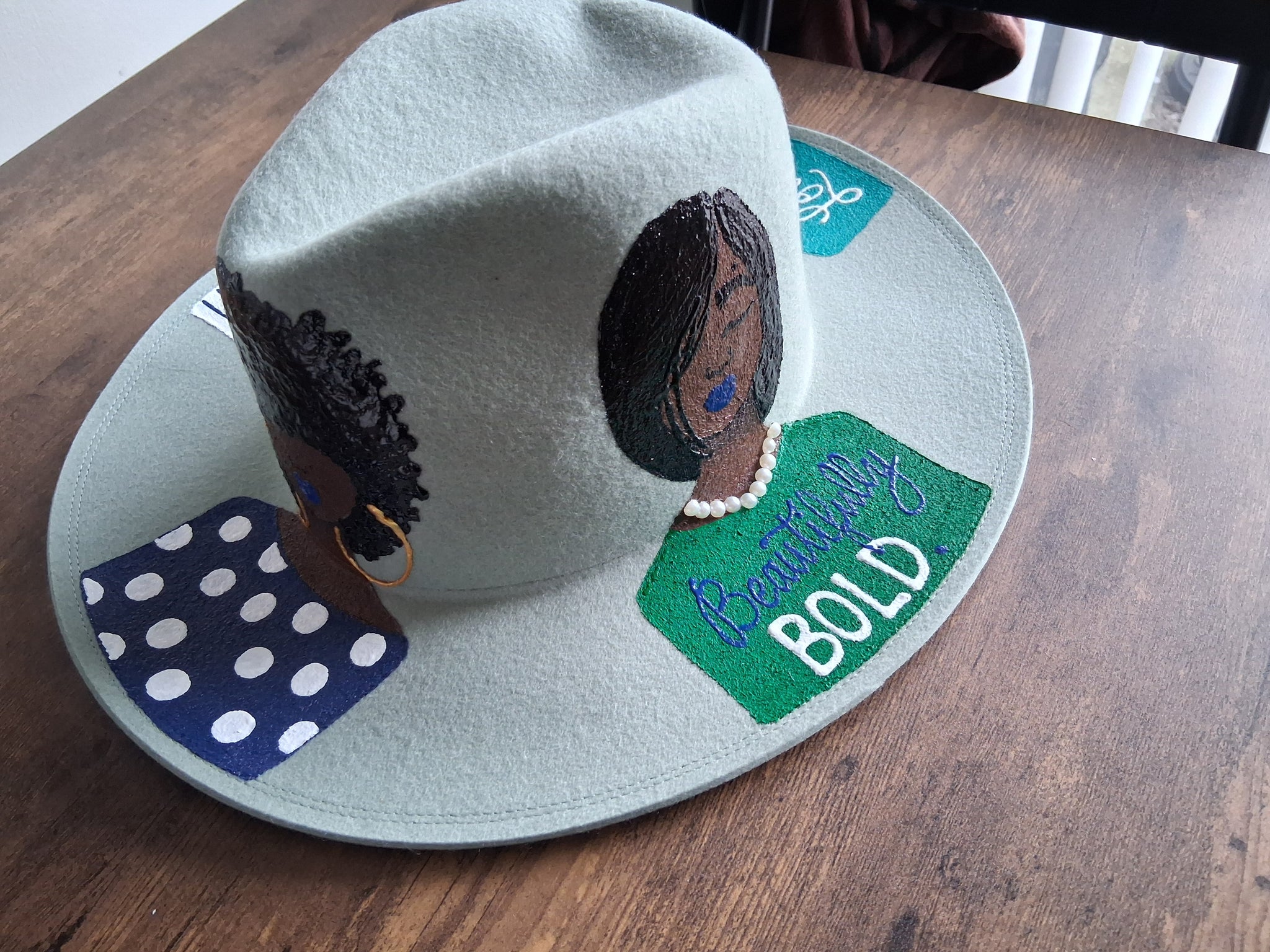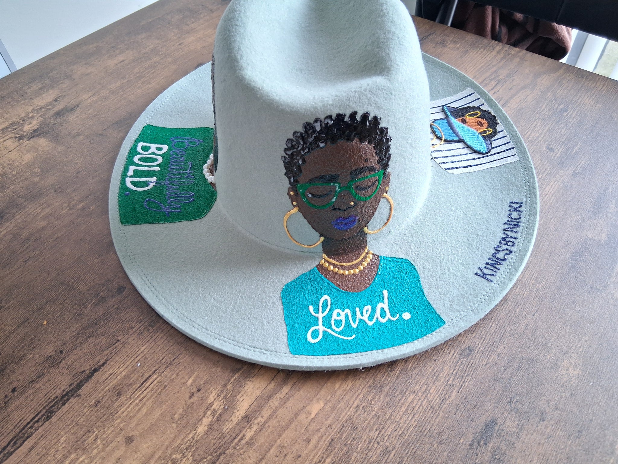 This satin lined fedora is made of wool, is adjustable and hand-painted with original artwork.
