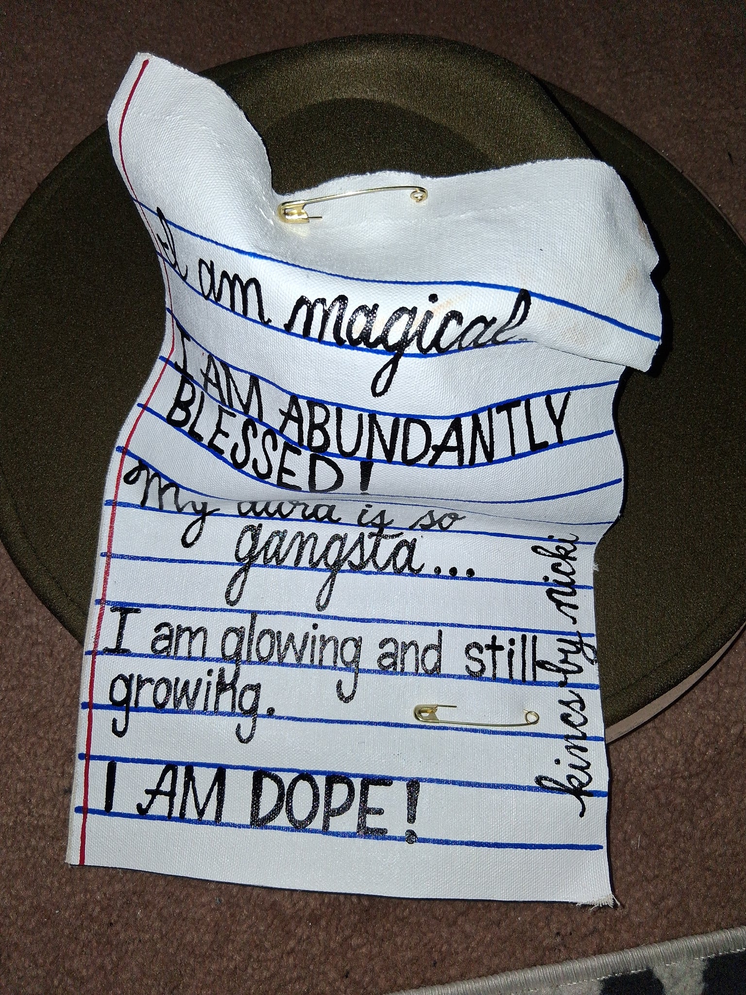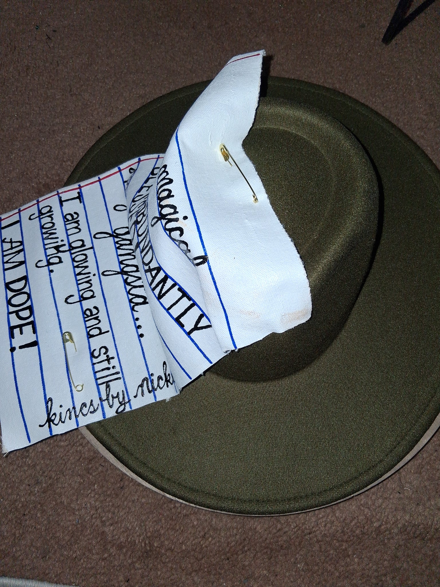 The olive felt fedora has a wider brim. It's a little charred and comes with painted canvas paper and safety pins.