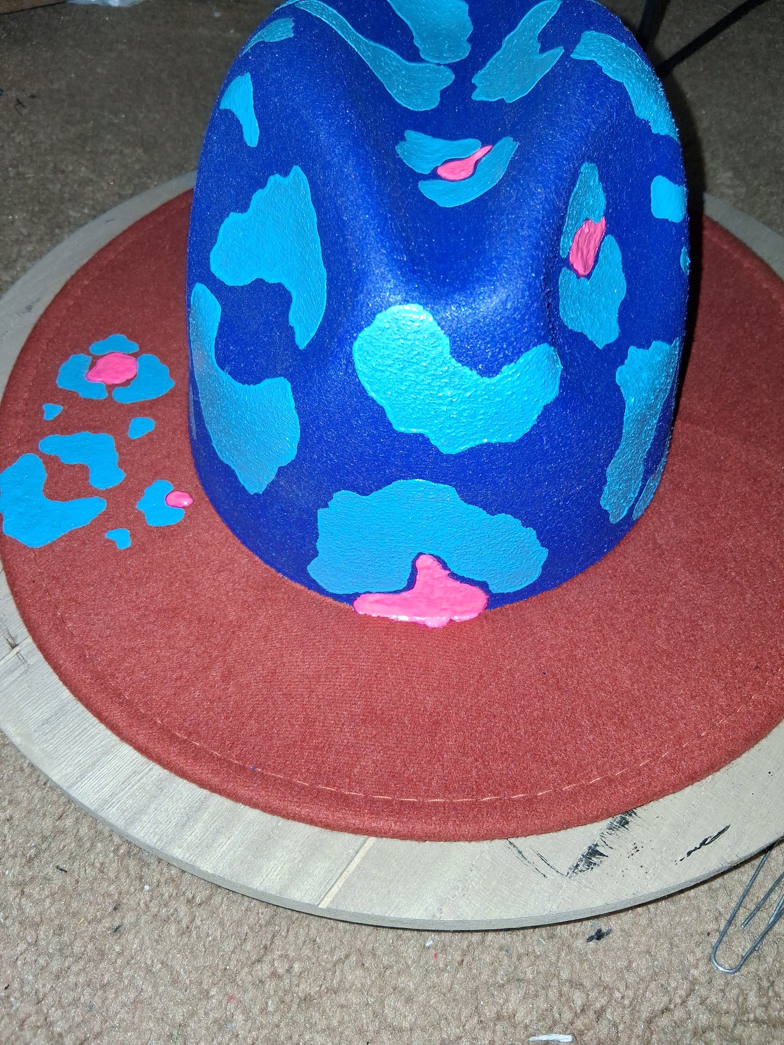 This rust fedora has a smaller brim. It's adorned with fabric and dimensional paint.